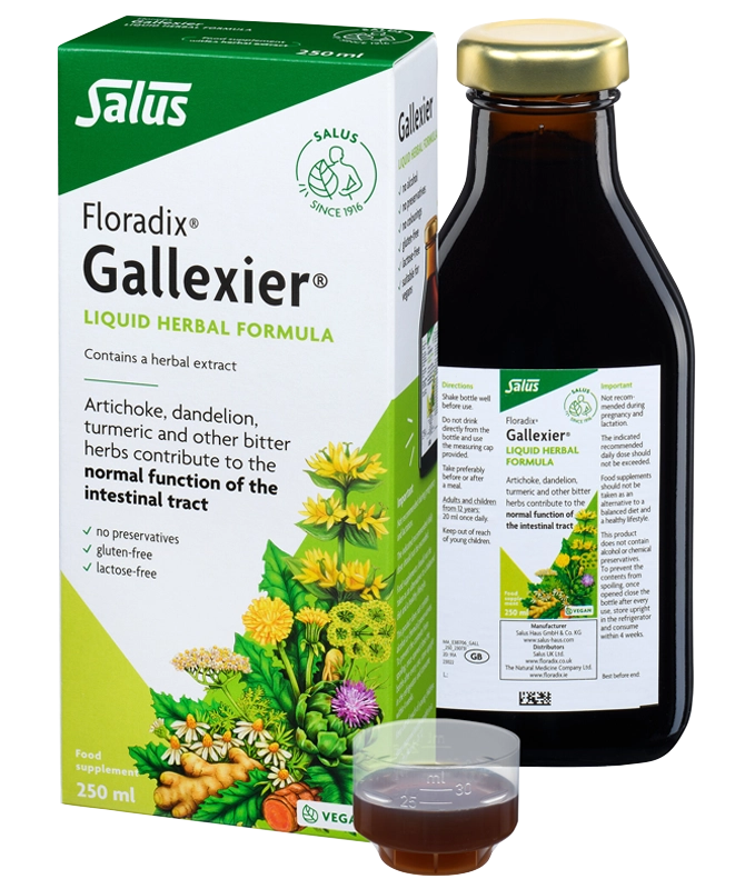 Gallexier is a liquid formula containing among others; artichoke, dandelion, turmeric and other bitter herbs such as gentian and ginger.